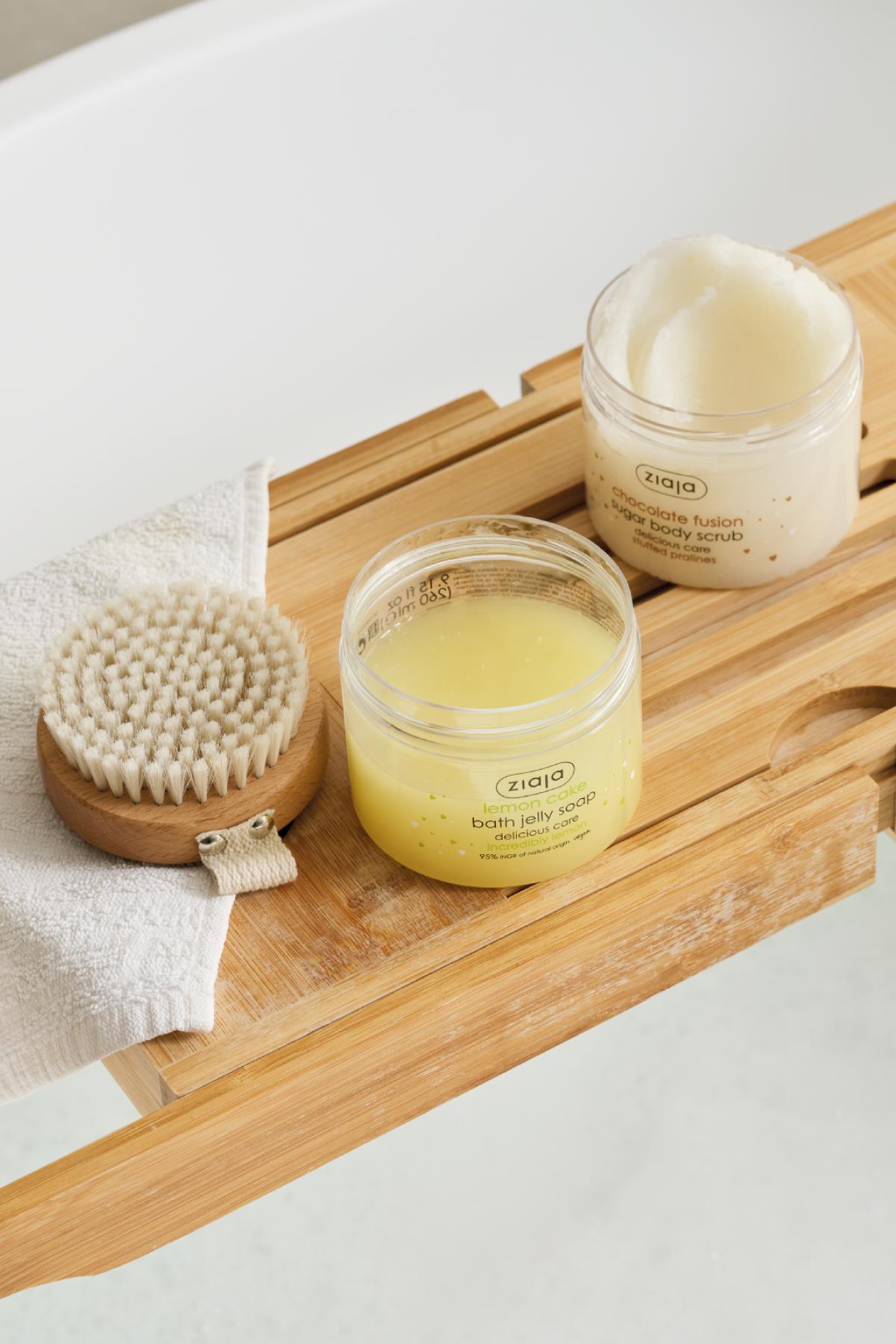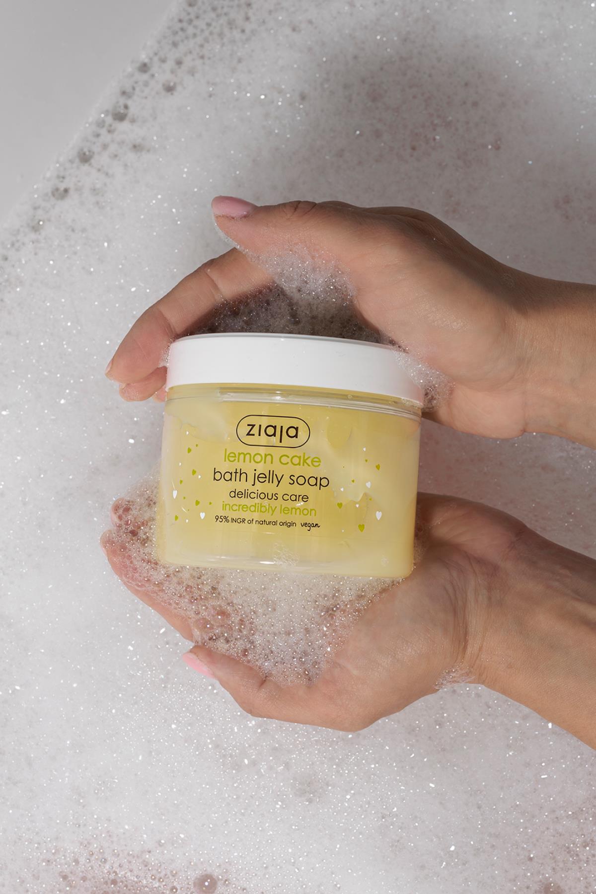 Limonlu kek şekerli vücut peelingi, jöle sabunu tamamlayıcı bir üründür.